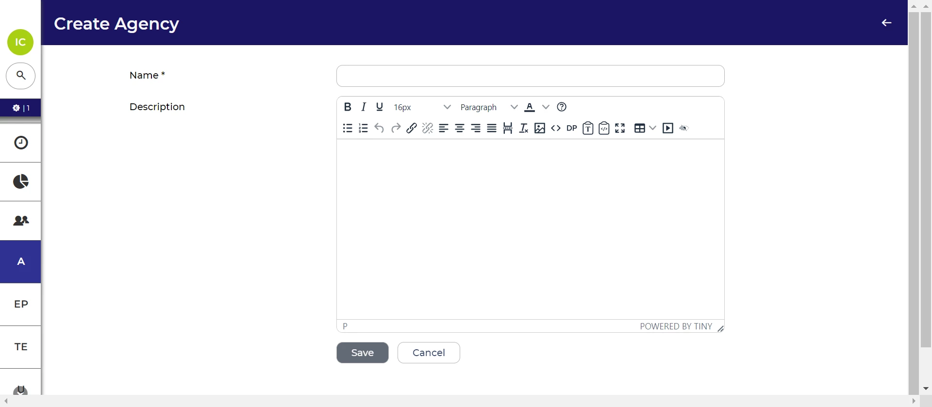The first part of the process is to add the agency to the system. You will be asked to enter the agency's name and can also add a description.