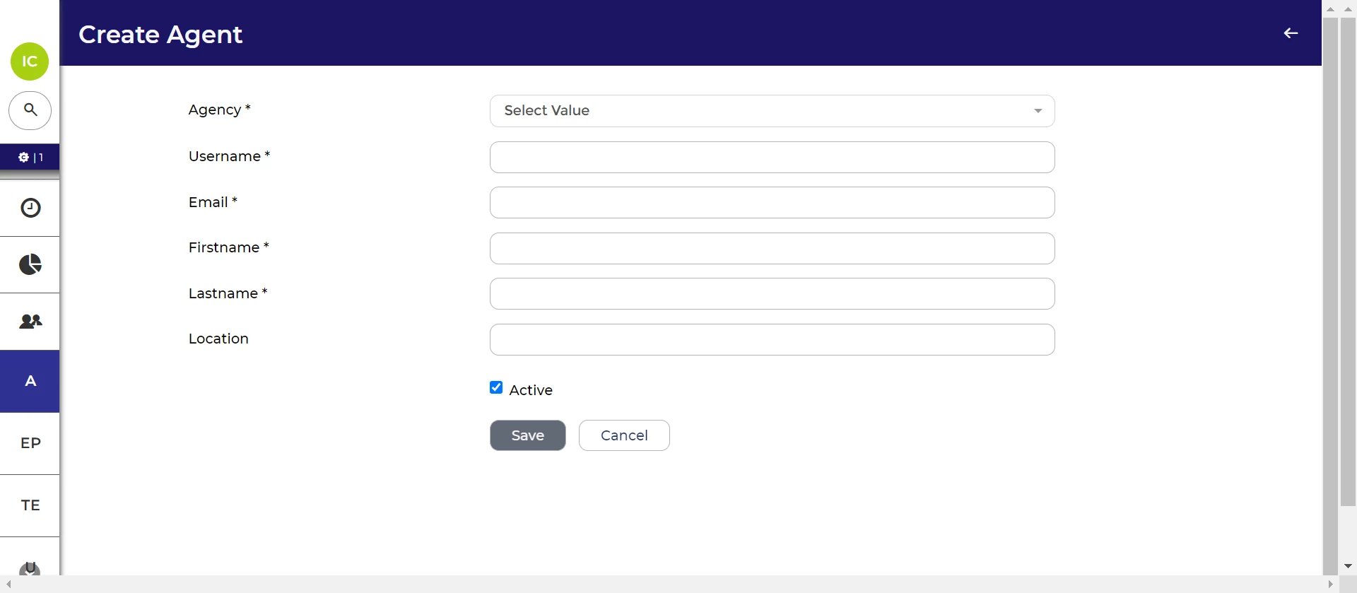 • Location (non-mandatory) - This free text field allows you to specify the agents location or address. Your list of agency users table layout may include the ‘Agency Location’ column.