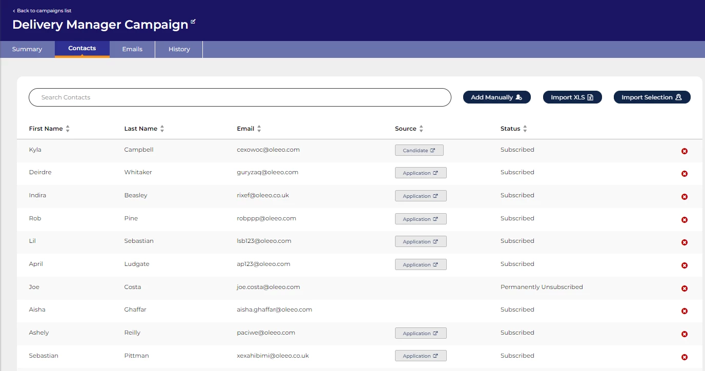 - Source - If candidates were added to the Campaign from a candidate or application list, a button will be displayed which will take you directly to the candidate account or the specific application.