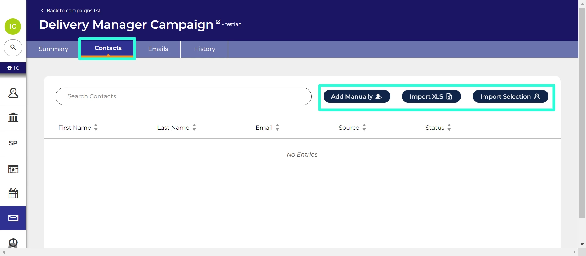 - Add Manually: Allows you to manually add a new candidate to your CRM campaign by entering their email address, first name, and last name.
