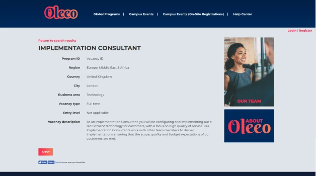 - Link content to a page created within Oleeo to house your information or link to an existing web page.