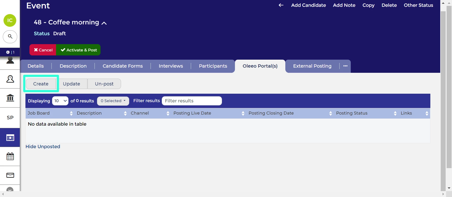 Oleeo Portal(s) tab, sometimes labelled ‘Posting’. - Click on 'Create' to start a new posting: