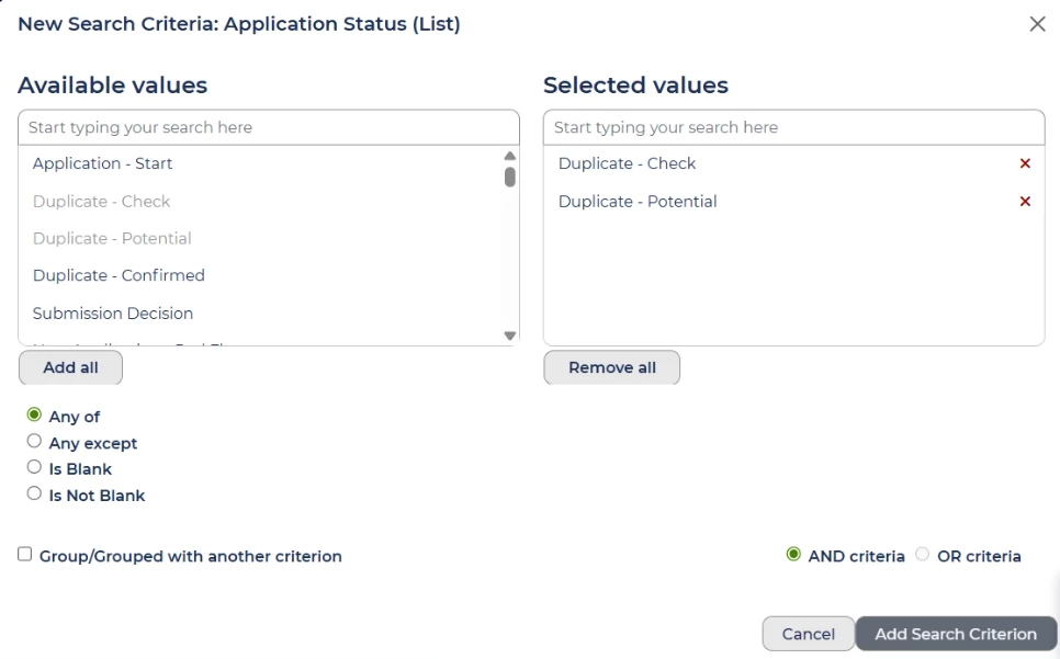- 'Is Not Blank': Use this to exclude applications that lack a date for the specified field. For example, when searching using the Submission Date, you can use this to exclude applications that have not yet been submitted.