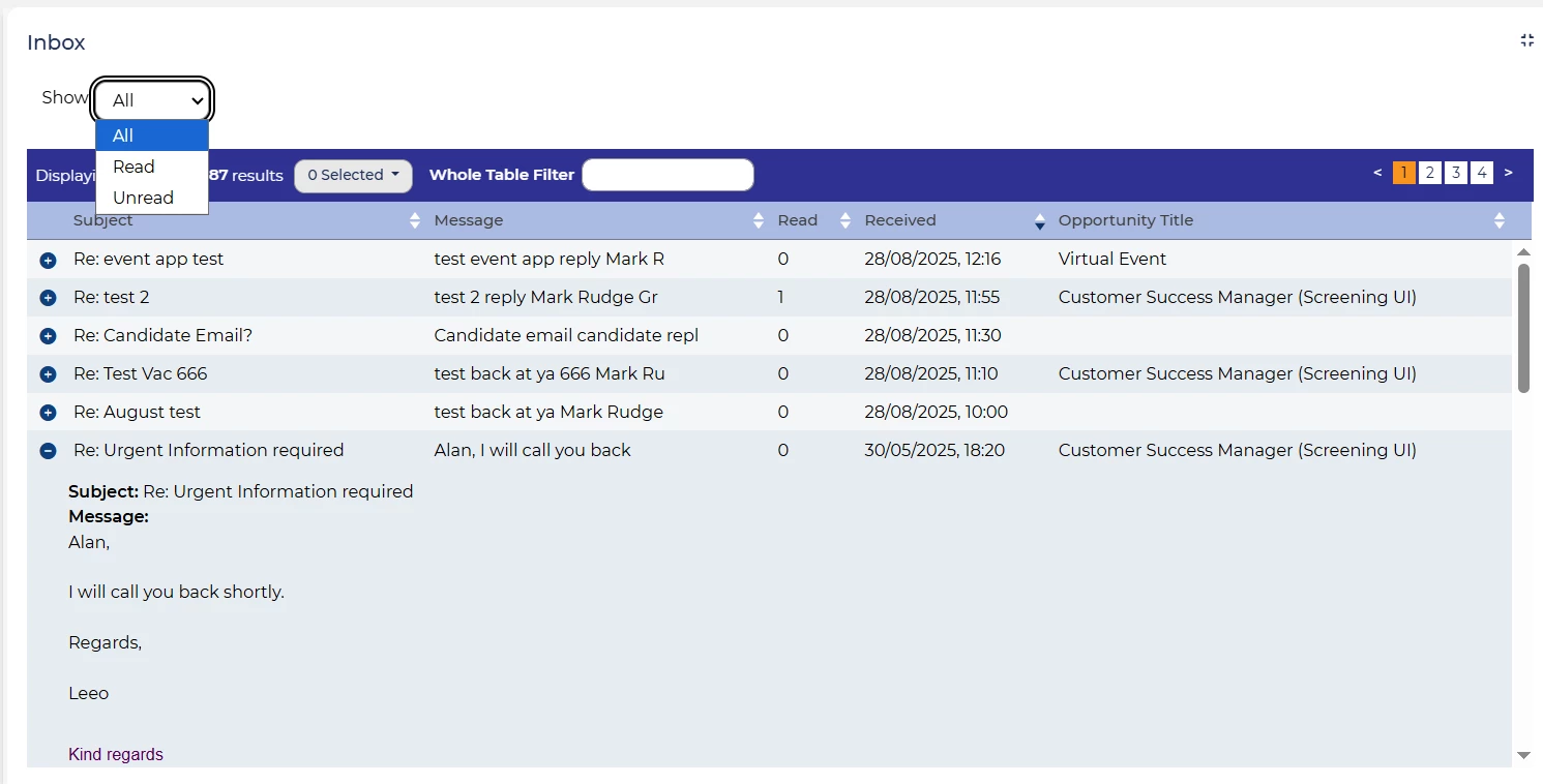 The new dashboard Inbox widget ensures you can easily track which candidates have sent communications to the system, which ones have been read and which ones still need to be actioned, sorted by date:
