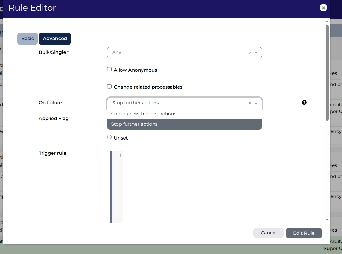 For advanced self-configuration users, there’s now additional customisation for your process flows. You can now define what will happen if a rule’s action fails. You’d be able to see this in the application’s history.