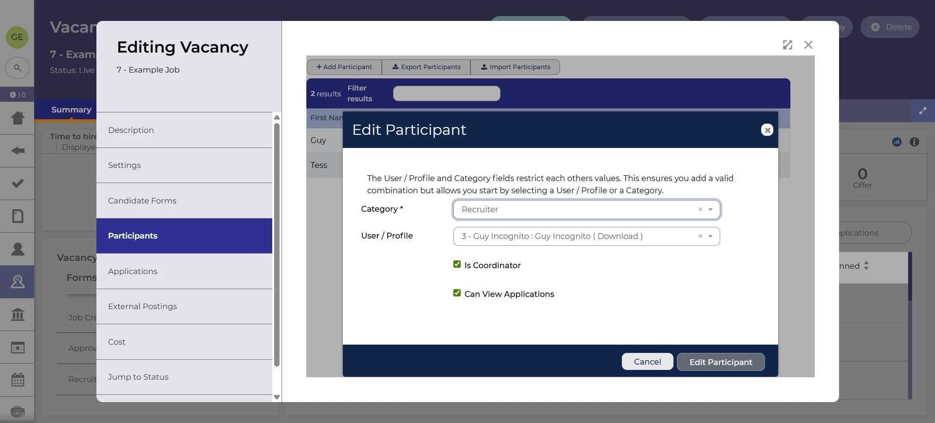 When adding a participant to a vacancy, you need to choose a user and a category. We’ve swapped the display order of the these fields to provide a more logical and user-friendly layout. With this change, you’ll choose a category then see a filtered list of users that match.