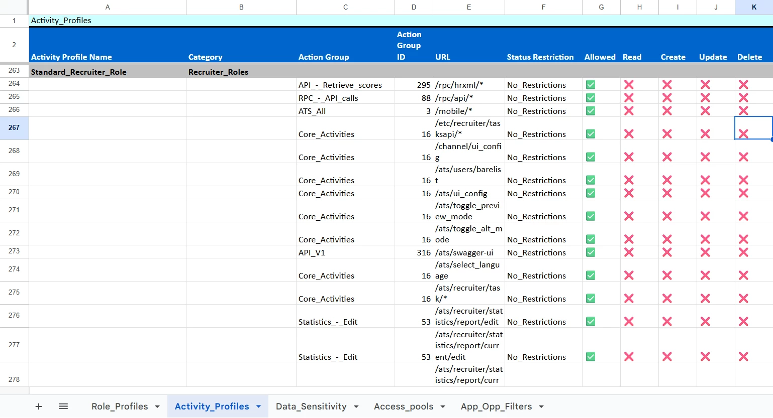 - Activity Profiles. Contains the list of Activity Profiles, with their corresponding category, and which Action Groups and URLs they have access to.