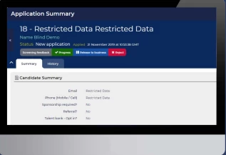 Our name redacted recruitment solution removes any identifying factors from a candidate application or CV, such as name, school, universities or location. You can decide which information you would like to hide from applications and when you would like them to appear and choose who they appear for (line manager, screener etc).
