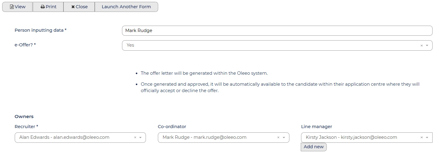 - Please note - You can have the option to not utilise the e-offer process for specific candidates, which can be useful if you have sensitive hires where you would not want some or all of the hire information appearing on the system. In this case you would choose e-offer - No.