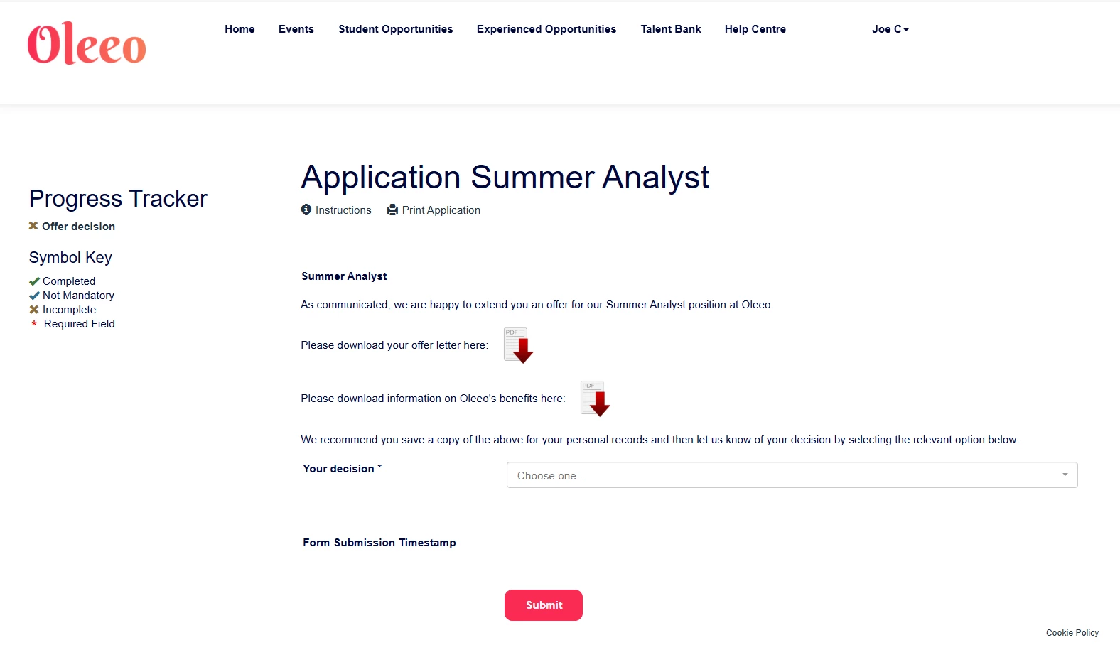 - Lastly the candidate just updates the decision field to make their decision and fully update the system.