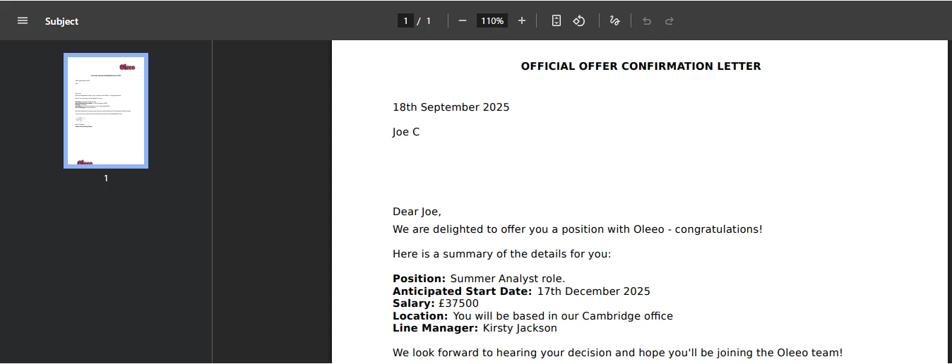 Significantly reduce time-to-hire. By automating the offer and contract generation process, you can send out a professional, customised offer in minutes. Candidates can then review and accept it online instantly, eliminating the delays associated with manual paperwork and back-and-forth communication.