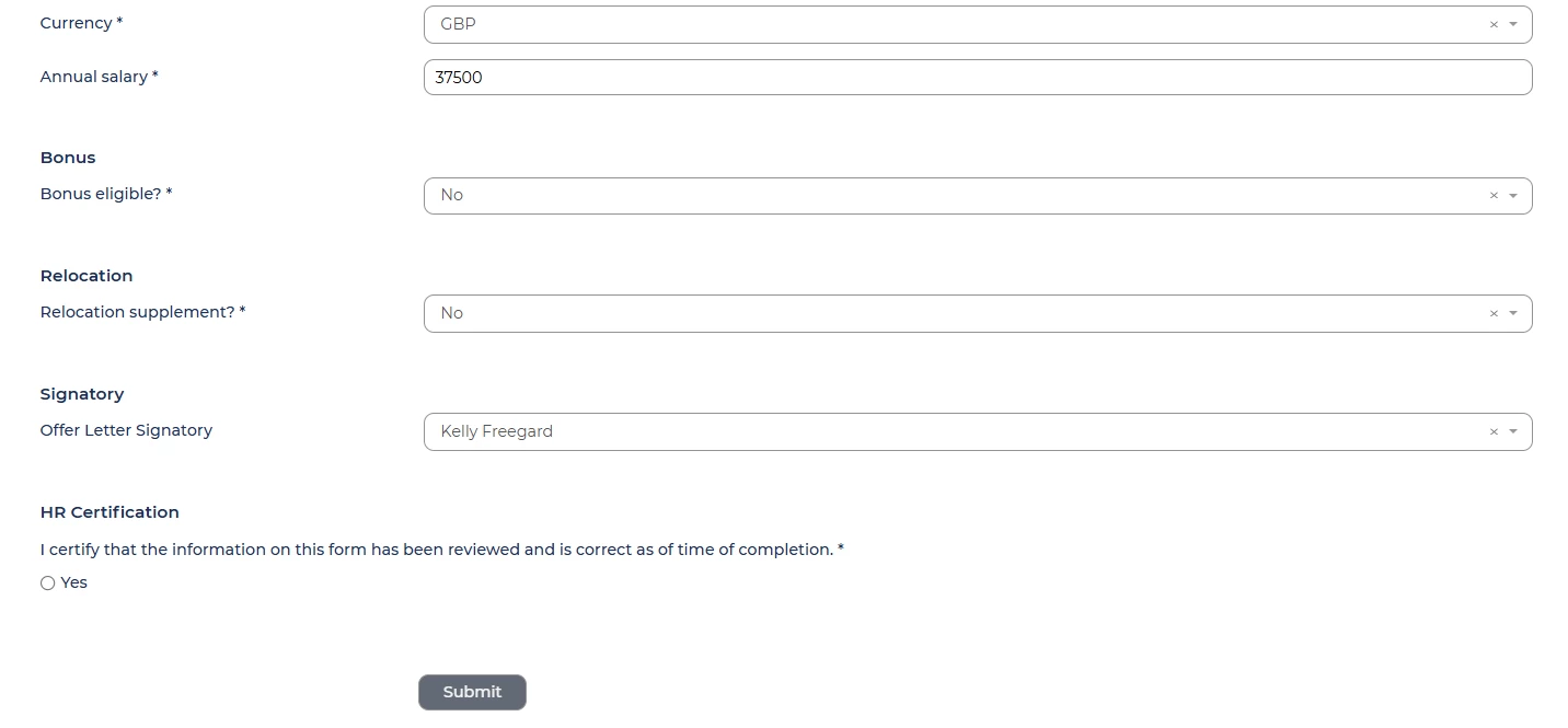 - Step 1 - Offer Form - Update the Offer form, so that all the information that needs to be recorded (much of which will be inserted into the contract), is added to the system. This will include essential information for contract generation, like the agreed salary and benefits offer, the agreed starting date and location and any other important information like relocation supplements, working hours/rota and annual leave allowance.
