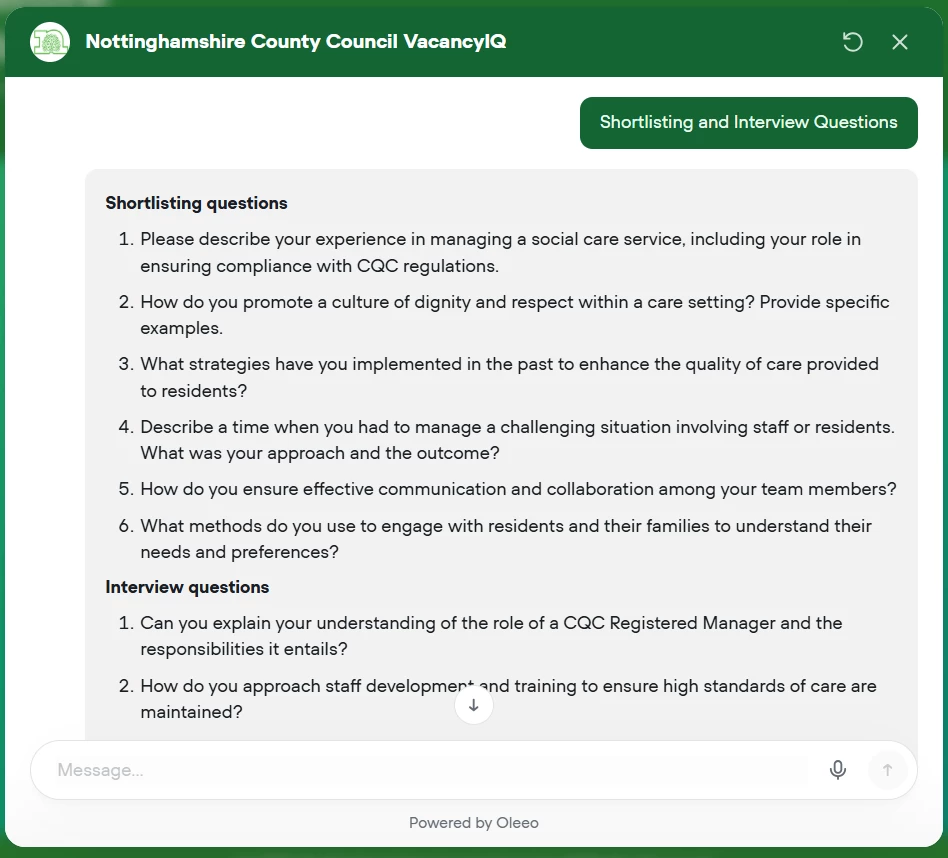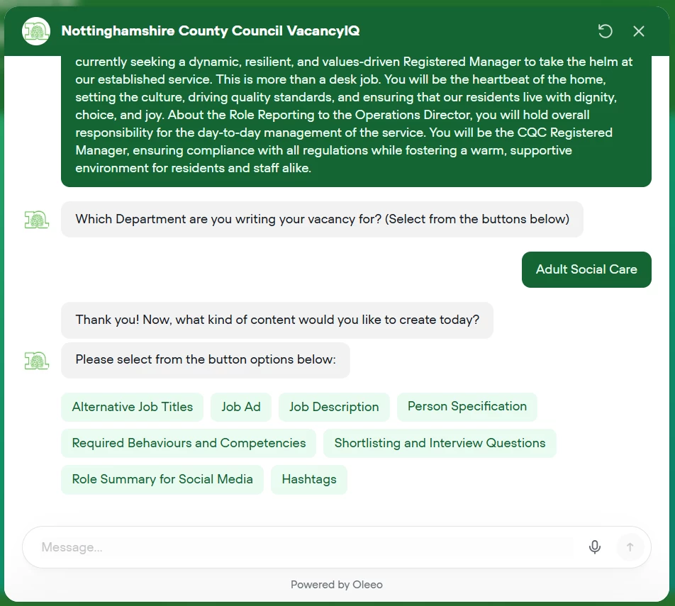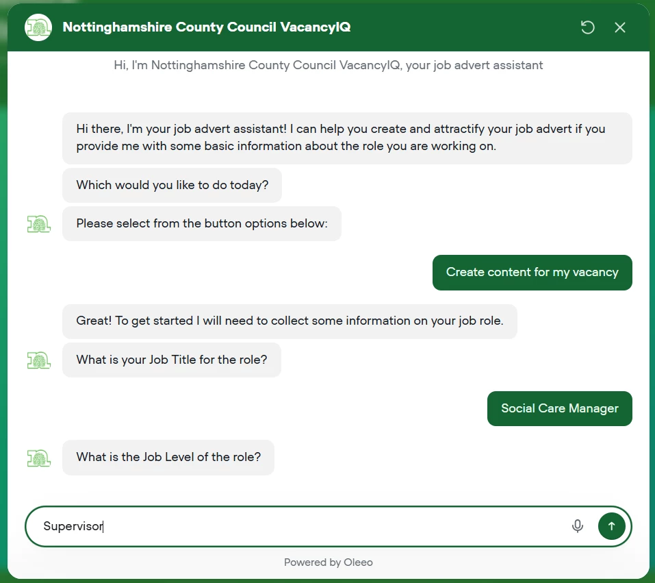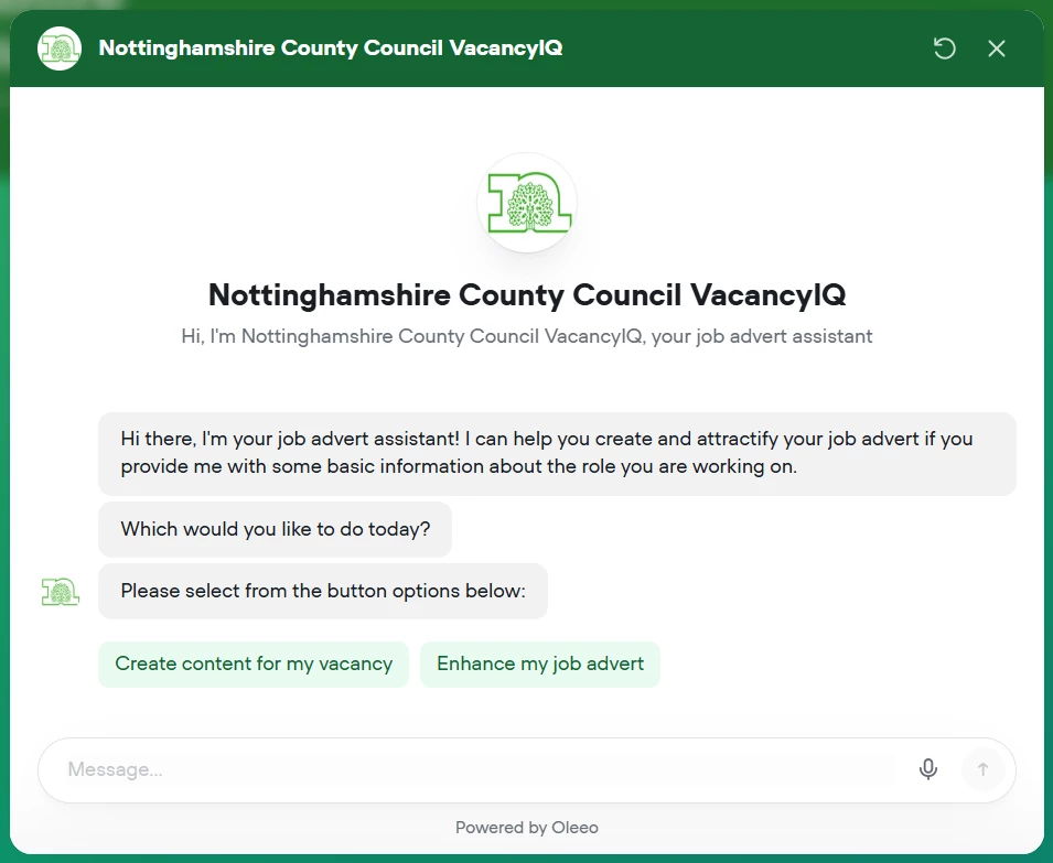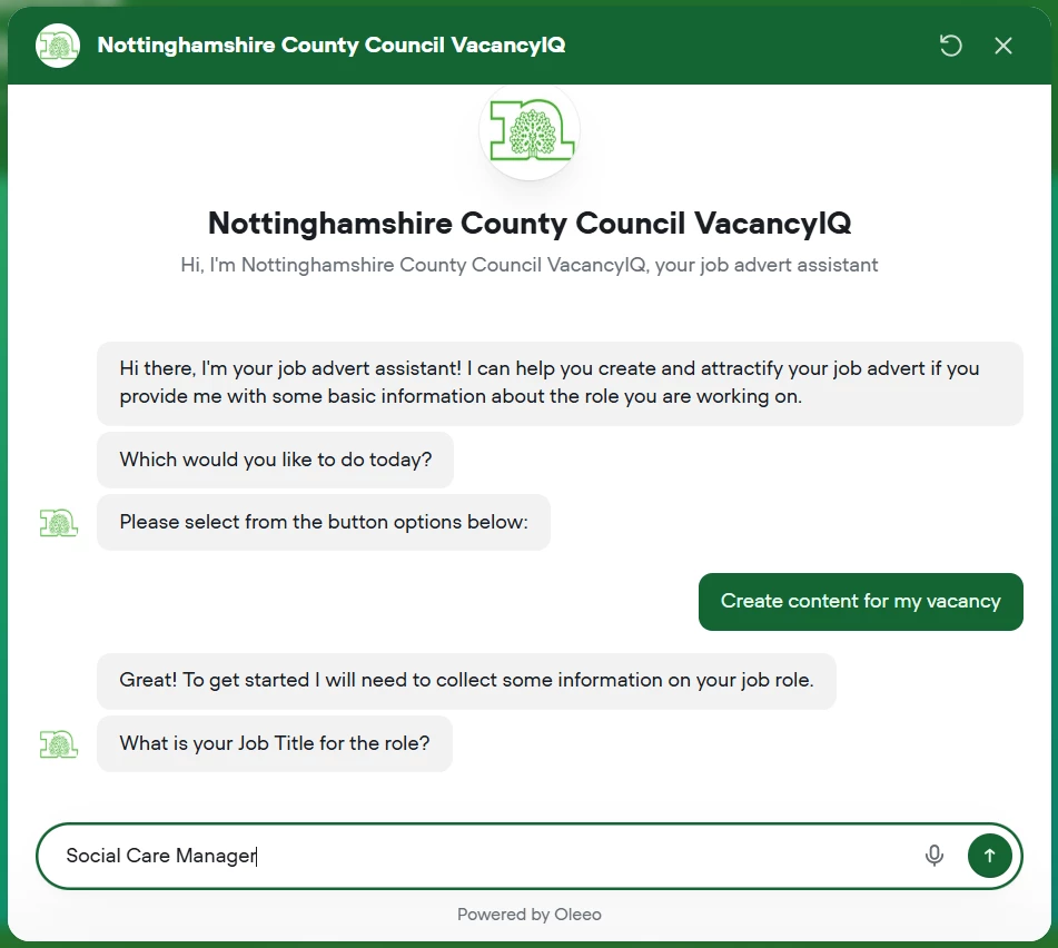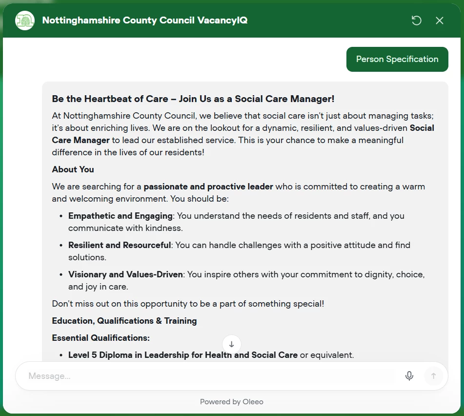 Built by Oleeo, VacancyIQ helps you go from “We need a role” to a ready-to-share job advert, description, person specification, behaviours, and interview questions – in one simple workflow.