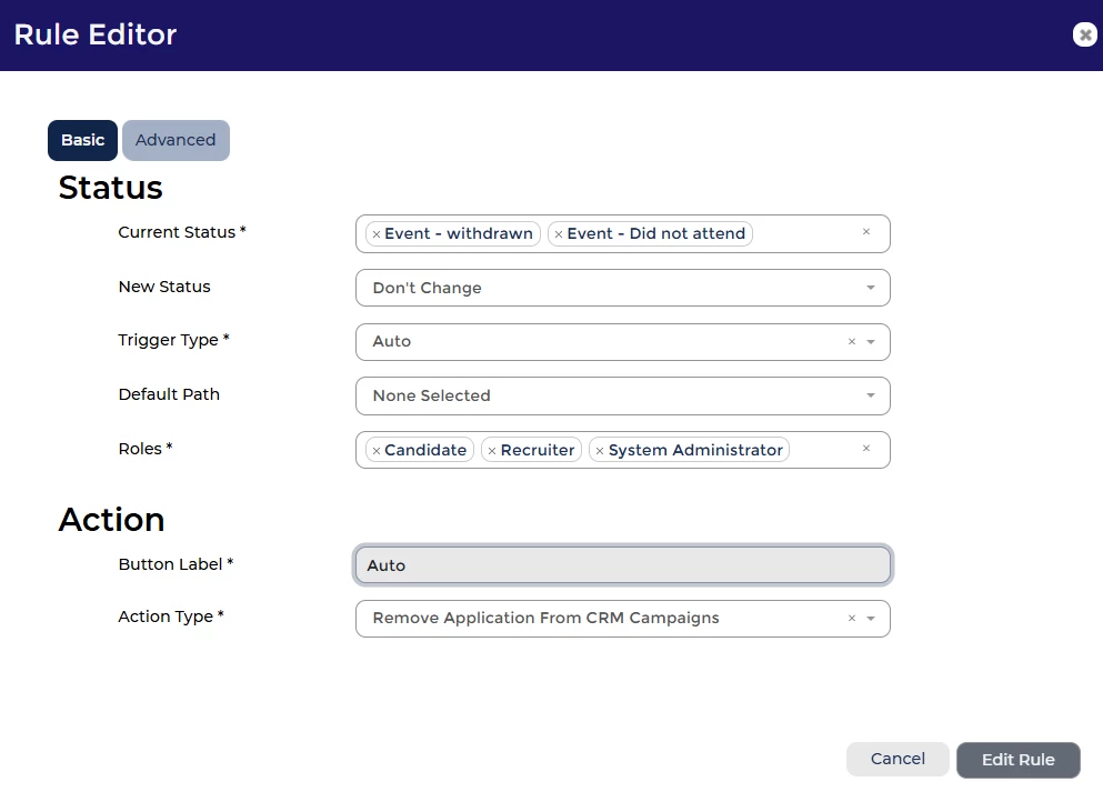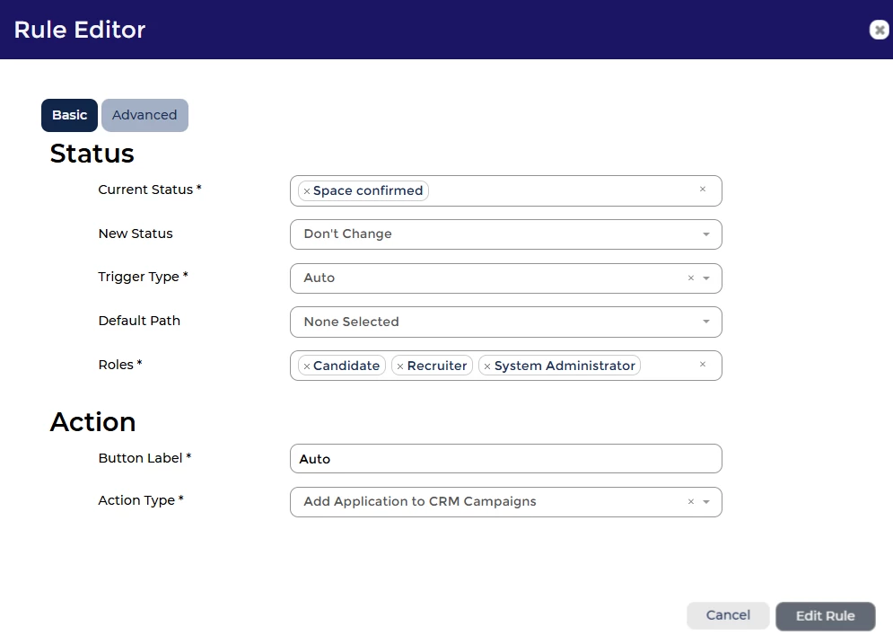 As with any process rules, create a new rule against the status(es) where you would like your candiadets to be automatically added to a campaign. Use the below example to complete the settings, choosing ‘Add application to CRM campaign’ or ‘Remove application from CRM campaign’ as the action type.