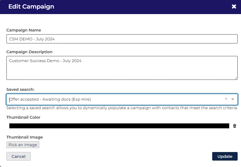 Both new and existing campaigns will provide the below edit campaign option, which will now allow you to select the relevant config saved search for your specific campaign. Without this step, the system will not know which candidates to add to your campaign and so nothing will automatically populate, nor will any candidates be removed automatically.