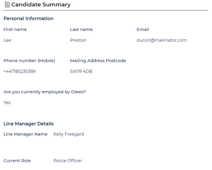 🔧 Use case: My vacancy has attracted internal applicants, and I need to see their current role and Line Manager so I can follow up on performance ratings. With a dynamic form, this information is surfaced straight away. For external candidates, details like notice period, salary expectations, and right to work status are far more relevant than internal performance data. The dynamic form ensures I see the right details for each candidate type, keeping the summary focused and role-appropriate.