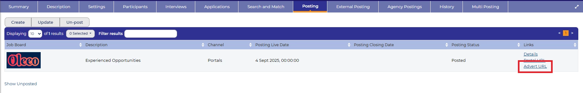💡 Before publishing a role to your careers site or Oleeo job board, schedule the posting live date in the future. This will generate the ‘Advert URL’ link. Open the link to preview the advert.